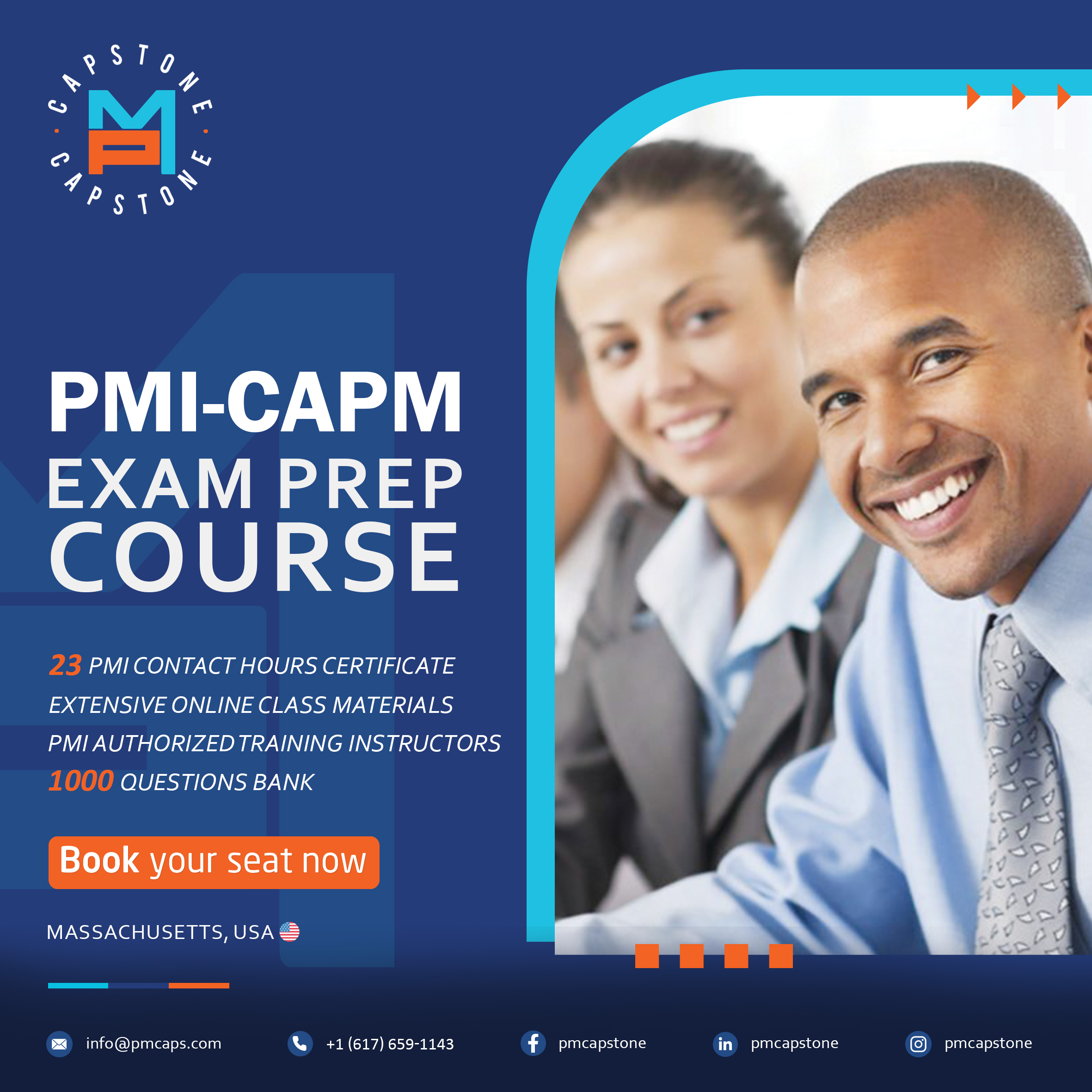 Virtual Classroom: 4 days of web-based eLearning with a live instructor. You will also receive CAPM exam prep training materials